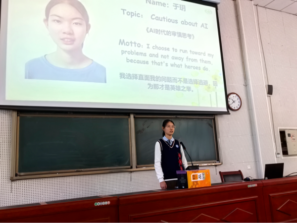 决赛现场,选手们以英语为交流纽带,将名人故事与时代思考深度结合,让思想火花在舞台上充分展现。比赛中,部分选手借谷爱凌的批判性好奇心,传递青春在时代浪潮中的闪耀力量;有选手分析梅琳达·盖茨的 “信任网络”理念,以理性思辨探讨个体迈向美好未来的路径;还有选手聚焦里希·苏纳克对 AI 的审慎思考,用真挚表达引发全场对青年责任的自我反思。