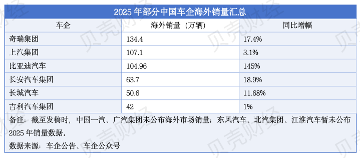 2025年部分中国车企海外销量汇总。新京报贝壳财经记者张冰制图