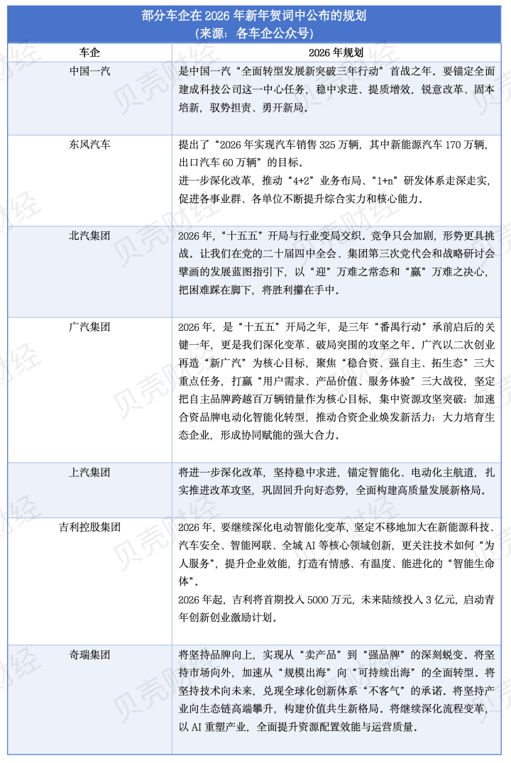 部分车企2026年规划。新京报贝壳财经记者张冰制图